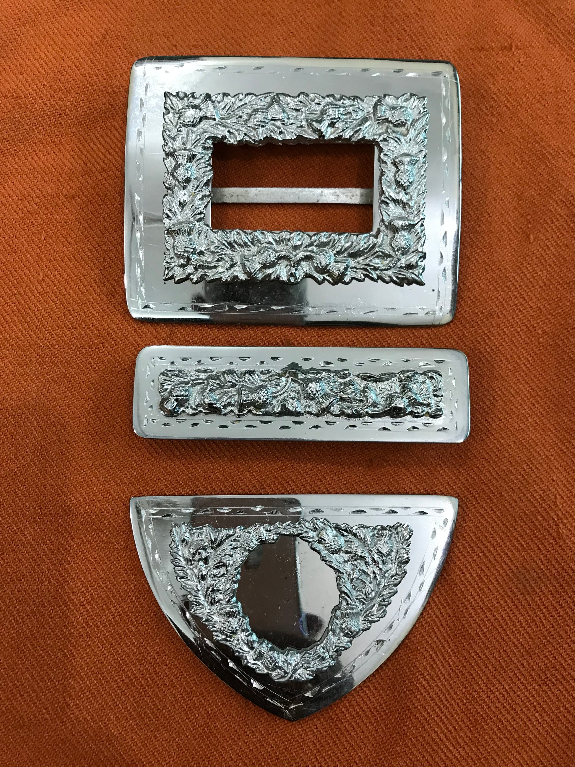 Piper's Cross belt with chrome plated chased mounts separately fitted on chrome plates. Available in Black or White Leather.