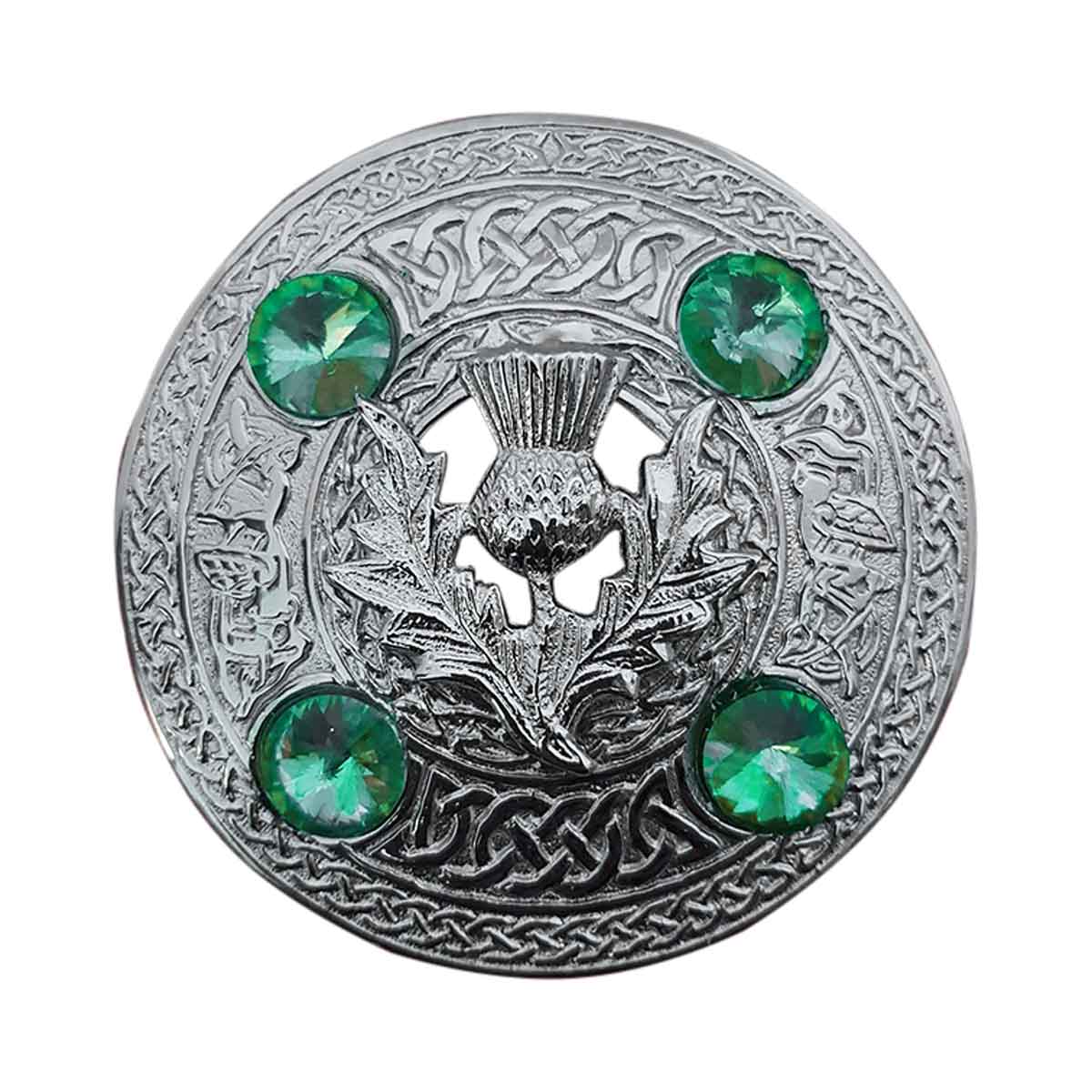 Plaid Brooch Thistle Flower Round 4 Green Stones